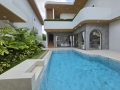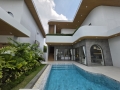 This villa showcases a modern tropical design with elegant curved architecture, warm wood accents, and high ceilings. The seamless indoor-outdoor flow connects the living space directly to the pool, creating a bright and relaxing atmosphere.