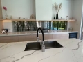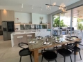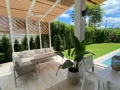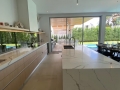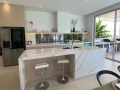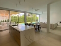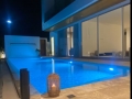 The ground floor features a spacious open-plan living and dining area connected directly to the pool through large sliding glass doors. The fully equipped kitchen includes an island, oven, double-door refrigerator, and dishwasher, along with a separate pantry, additional dishwasher, and coffee corner. A flexible room on this level can function as a guest bedroom or TV room, complete with a sofa bed, 75” TV, wardrobes, and an ensuite bathroom. A laundry room and guest bathroom are also provided.