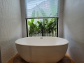 • En-suite bathroom with smart toilet, ample storage, and bathtub by a panoramic window