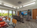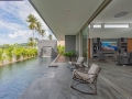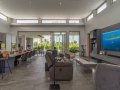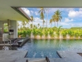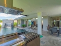 The gourmet kitchen is a dream for culinary enthusiasts, complete with a large central island, premium appliances, and elegant cabinetry. Designed for both practicality and style, it opens effortlessly to the outdoor entertainment terrace through oversized sliding glass doors. Beyond, the villa reveals its true centerpiece—an inviting infinity-edge swimming pool with cascading water features, surrounded by lush tropical landscaping. An outdoor kitchen and stylish sunken pool bar make this space perfect for sunset gatherings, weekend entertaining, or simply enjoying the calm tropical atmosphere in total privacy.